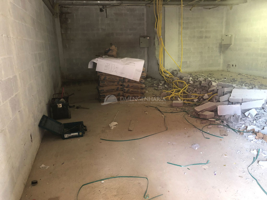 Foi executado instalação de forro de gesso acartonado de 12,50mm com tabica metálica, aplicação de massa corrida e selador em parede de alvenaria e gesso acartonado. O selador é importante para impedir que o acabamento fique manchado e a fixação da tinta prejudicada, execução de pintura em todo o perímetro da parede e teto. Cores utilizadas: Grafite Lapizeira p756 e Preto absolut R756. Construção de degraus e base em estrutura metálica de aço com tubo industrial quadrado 40×40, revestida com placa cimentícia LP Mezanino com capacidade para suportar até 500kg/m², intstalação de piso vinílico Dark Porcelain, Linha Ambiente fabricante Tarkett e para uma perfeita estética, foi instalado rodapé de 15cm em MDF na cor preta. No sistema de iluminação, foi utilizado fio antichama e isolação 750V/70ºC, cabeamento do sistema de áudio, balizadores em LED, iluminação de emergência e iluminação em geral. Para a exaustão e insuflação de ar, foi instalado trocador de calor, com a finalidade de transferir calor de um fluido para o outro, encontrando-se estes a temperaturas diferentes. Já na parte externa, foi aplicado 3 demãos de tinta e instalação de vidro de 10mm para recebimento de decoração.
