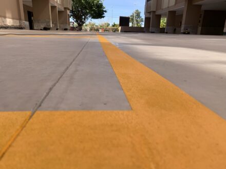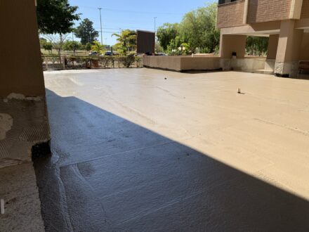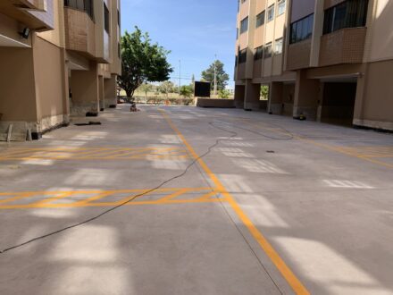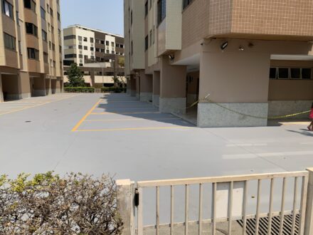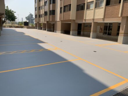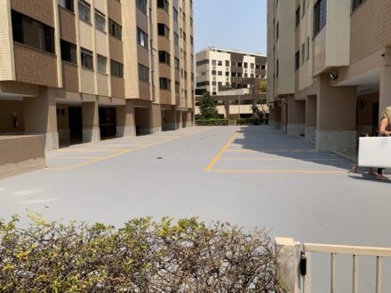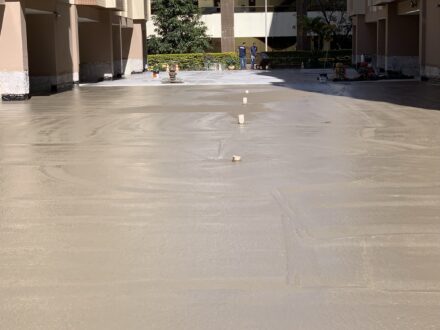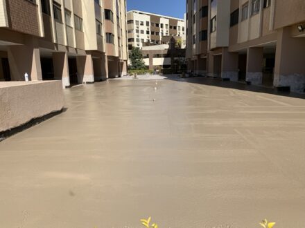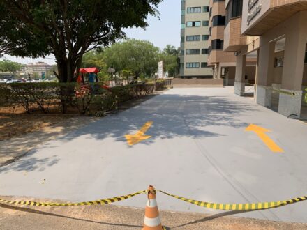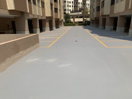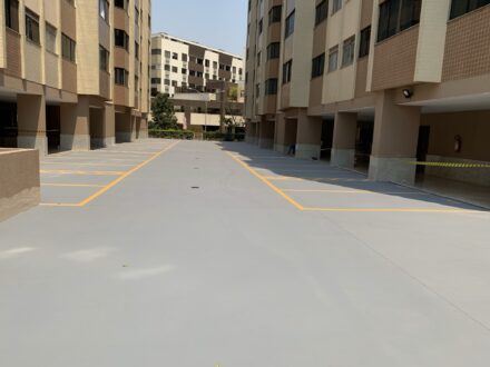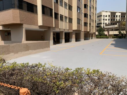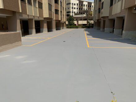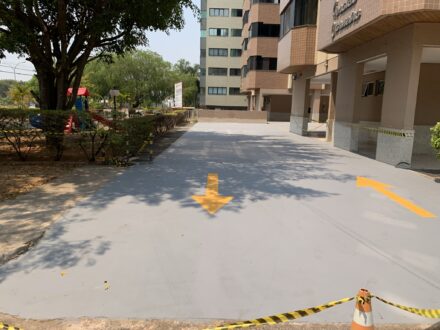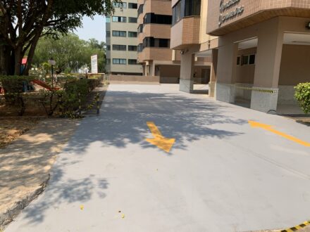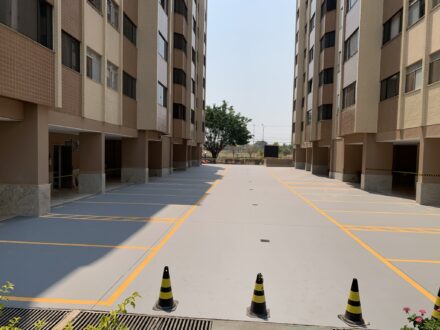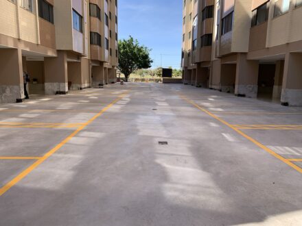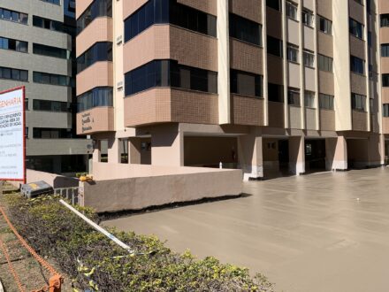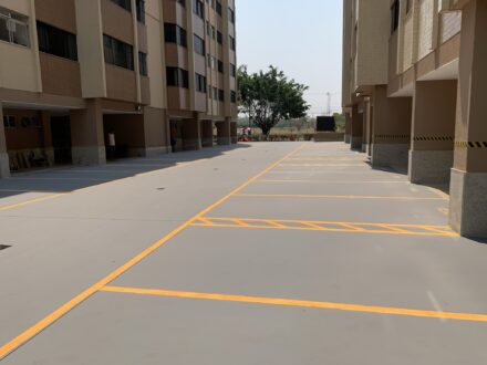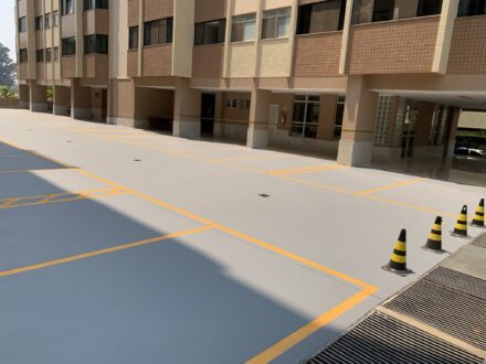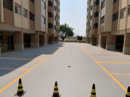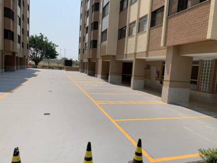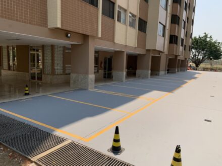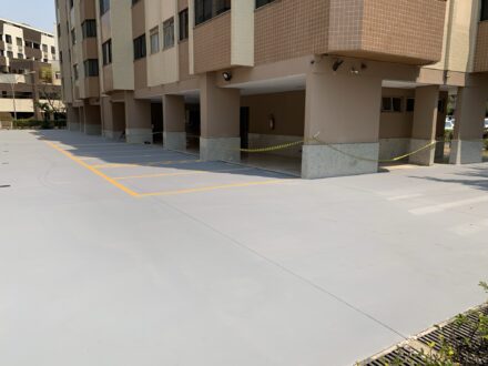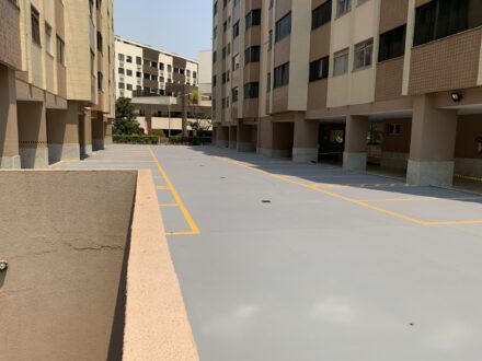 Após patologias e infiltração decorrente, a DM Engenharia foi contratada para impermeabilizar todo o estacionamento, incluindo o refazimento da proteção mecânica com concreto usinado, foi realizado o polimento do piso, pintura e demarcação.